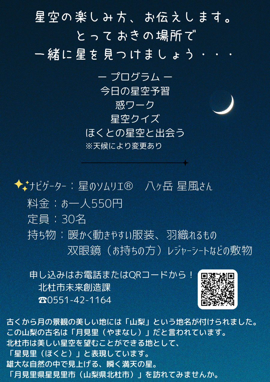 観察前に星空の予習もありますので、初めての方も楽しんでいただけます。