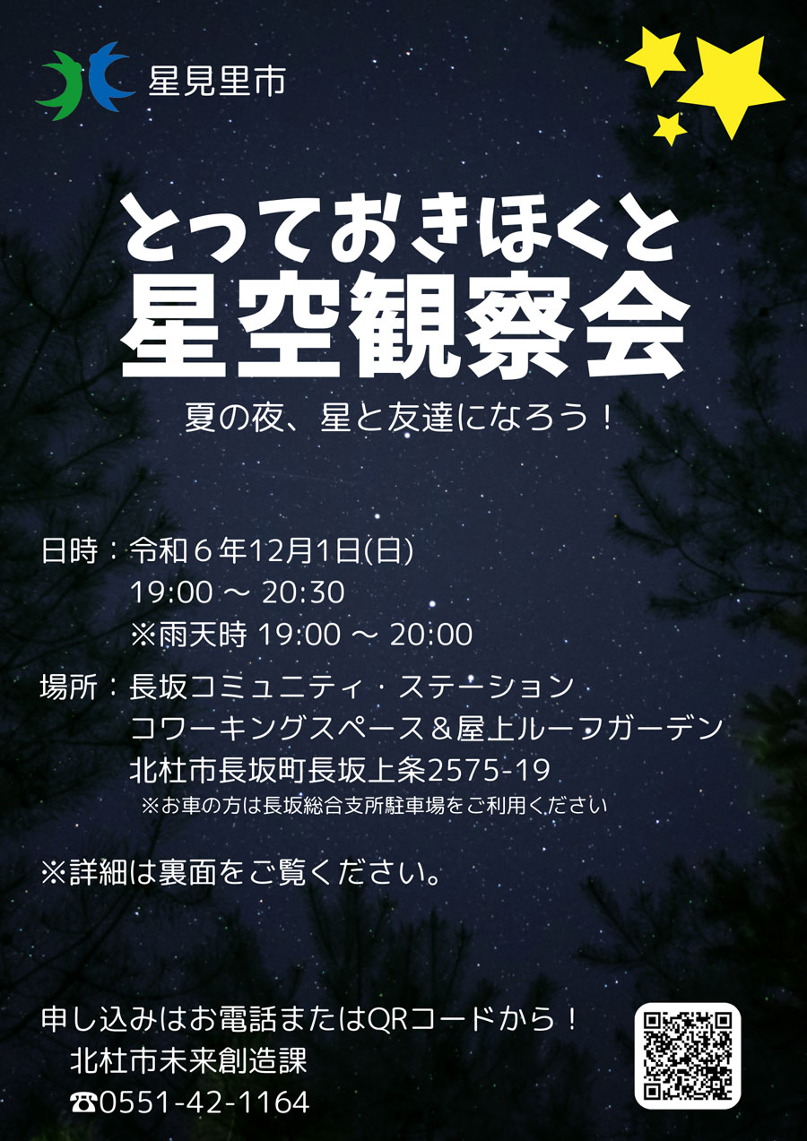長坂コミュニティ・ステーションの屋上ルーフガーデンにて、美しい星空を眺めながら、星空や天体の秘密を学びませんか?