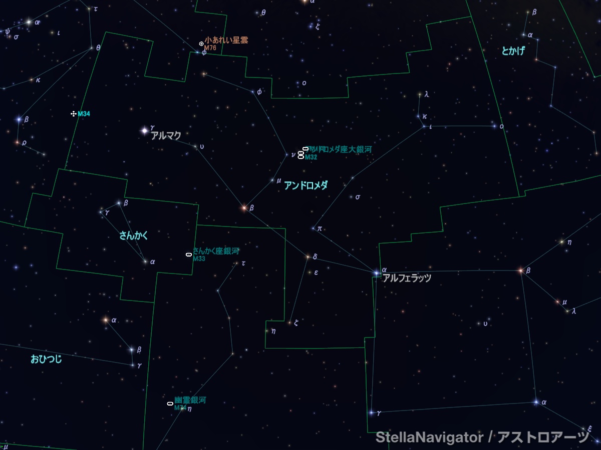 アンドロメダ座は、ペガスス座の西にある星座で、ペガススのおへそにあたる星アルフェラッツから、星がV字型に2列に並んだ形が目印となる。