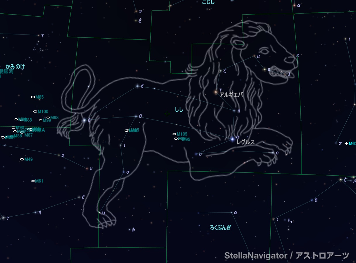 はてなマークを左右逆さまにした形は「ししのおおがま」と呼ばれている。「ししのおおがま」を頭にして、胸のところに輝く1等星レグルスと、しっぽのところに輝く2等星のデネボラといくつかの星を結んで、百獣の王ライオンの姿になる。