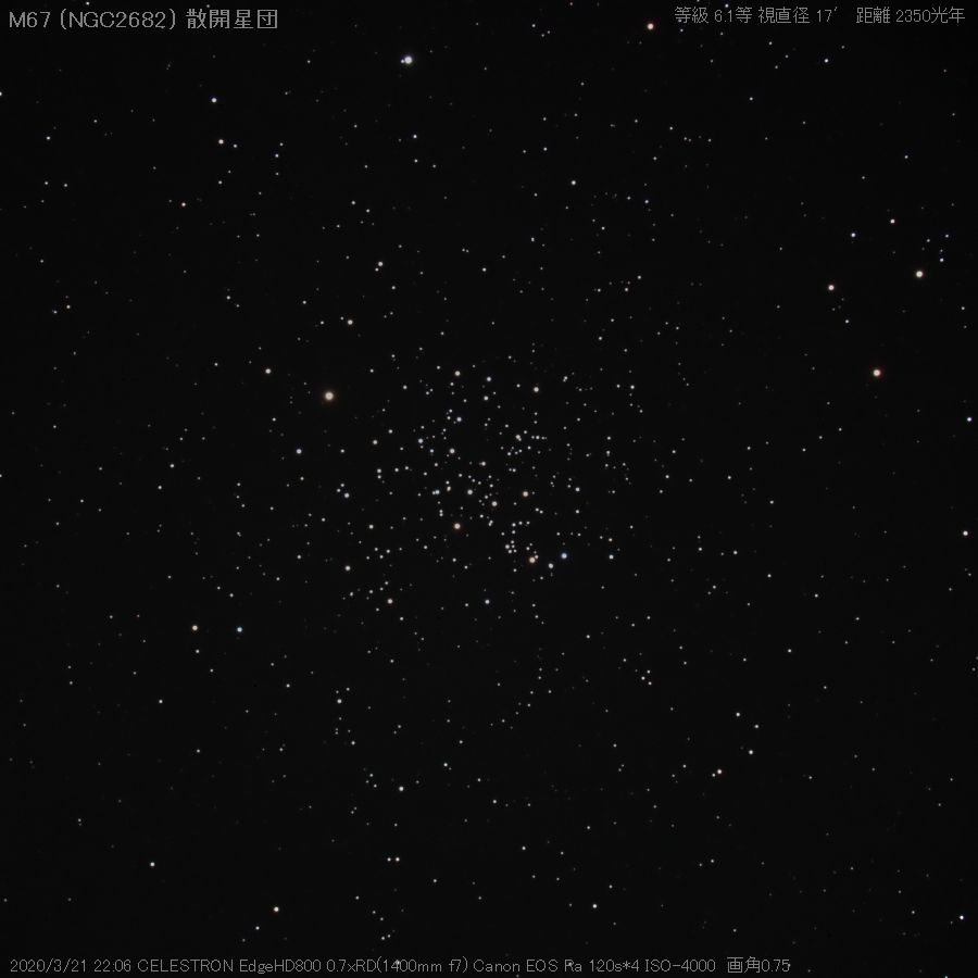 - 星数は明るいものだけで約80個、10等から16等の間に約500個、さらに暗い星も多数あるという大きな集団だ。散開星団の中では最も年老いたもので、50億年を超えるといわれている。星団中の星に系外惑星が見つかっている。