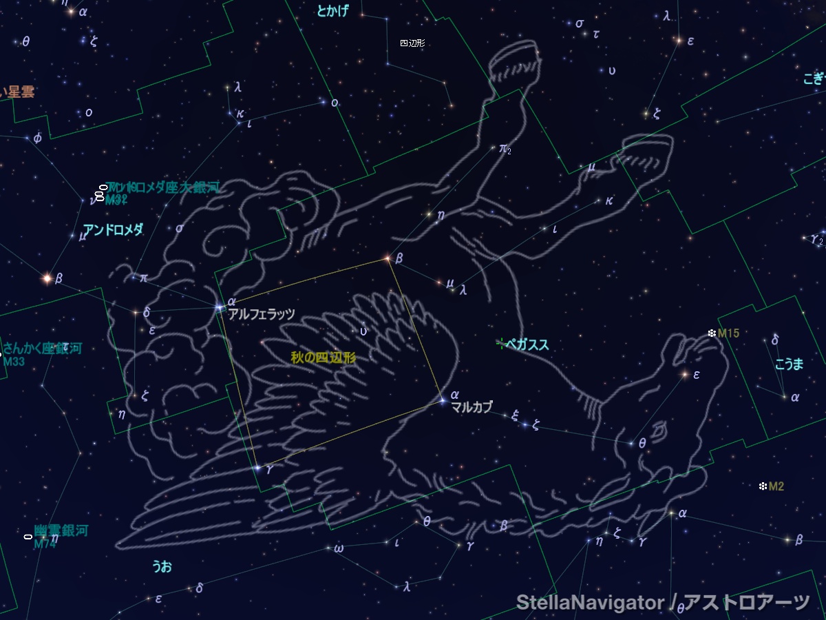 胴体にあたる部分の四辺形は、「ペガススの四辺形」、あるいは「秋の四辺形」と呼ばれている。この四辺形からは、秋の代表的な星座、アンドロメダ座や、みずがめ座などを見つけることができる。