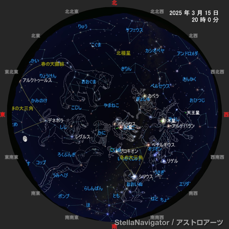 まだ、南西の空に7つの一等星が輝いて冬の星座引き立てています。東の空にはしし座・おおぐま座(北斗七星)が昇って来ました。