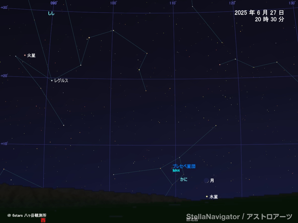 夕方~宵、細い月とプレセペ星団が並ぶ