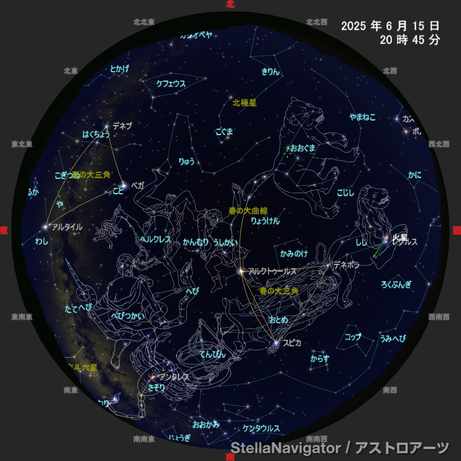 6月21日は夏至で、夜の長さが一番短くなり天文薄明終了時間も21時近くとなります。西の空には火星としし座のレグルスが沈みかけています。西北の空に七つの星が柄杓の形の北斗七星が見えます。北斗七星からうしかい座のアルクツゥールス→スピカに続く春の大曲線、しし座のデボネラを加えた春の大三角が春の星座の目印です。東の空には夏の大三角、さそり座が昇ってきて、天の川もアーチ状に見えてきました。