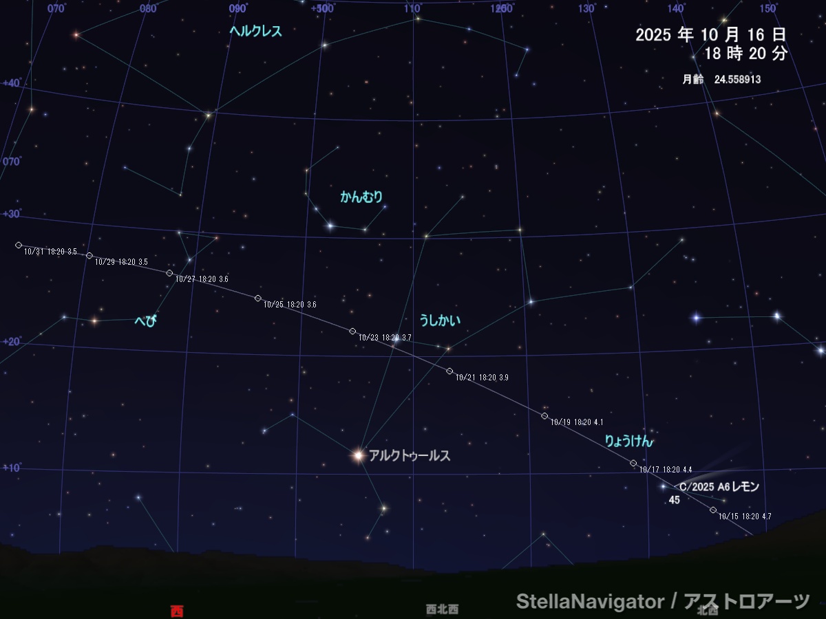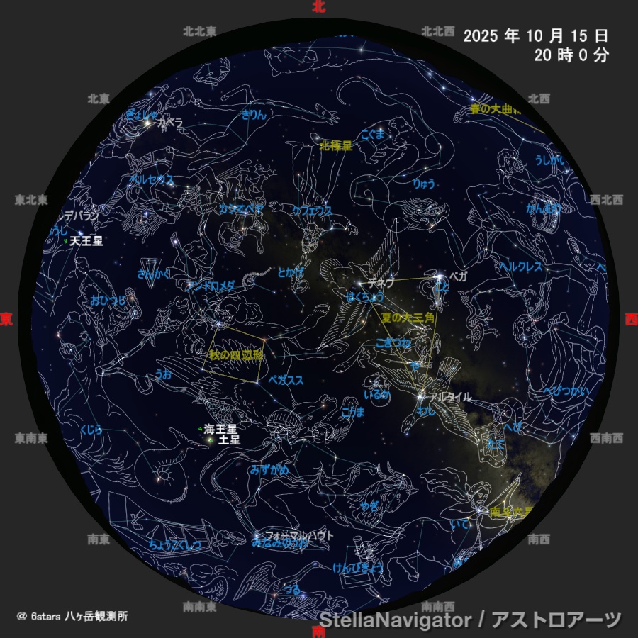 夏の大三角は西空ではくちょう座の北十字が立って見えてきました、秋の四辺形が空高くに見え、その下に土星、秋の唯一の一等星ホーマルハウトが見えます。