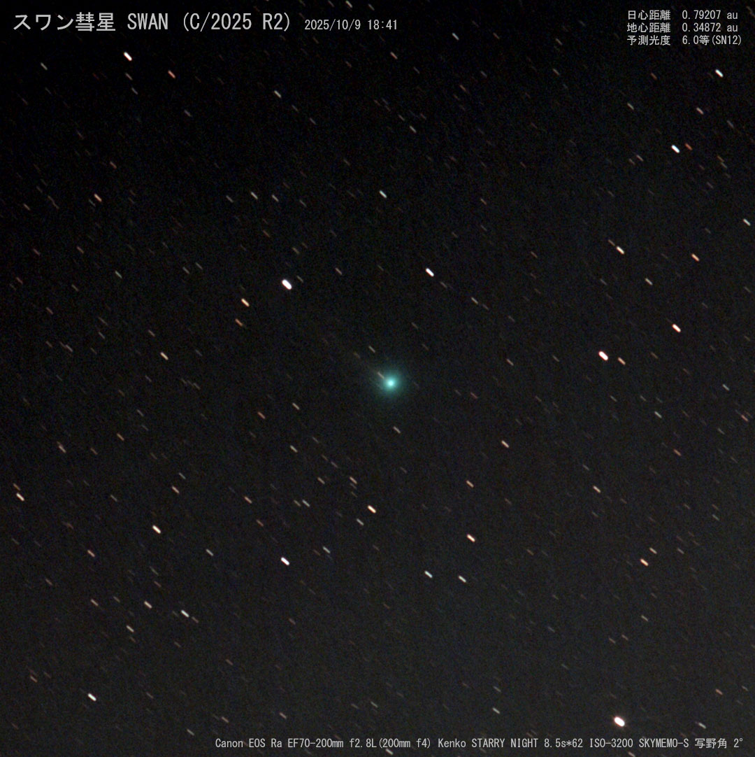投稿日: 2025年10月11日2025年10月13日9日のスワン彗星(C/2025 R2) 今日の空は小雨模様 9日のスワン彗星(C/2025 R2)をメトカーフコンポジットしてみました。総露出時間527秒(8分47秒)かけましたが尾の様子は左上に微かに名が出ています。コマの色がエメラルドグリーンに写っていたので満足です。 👍いいね 0