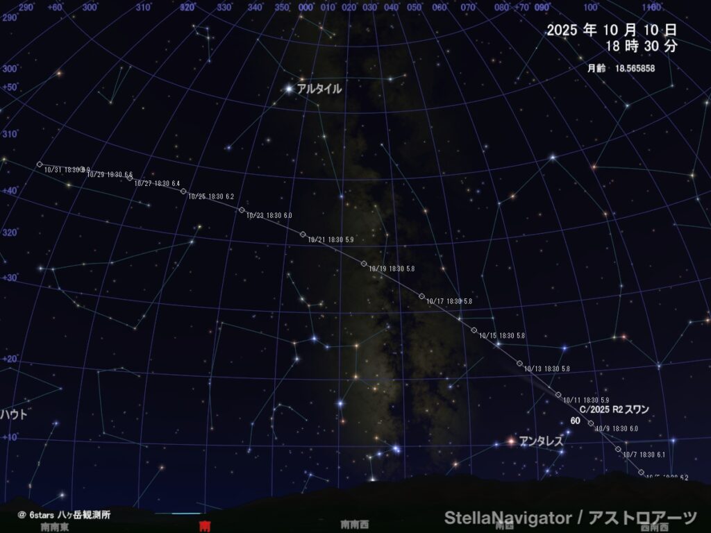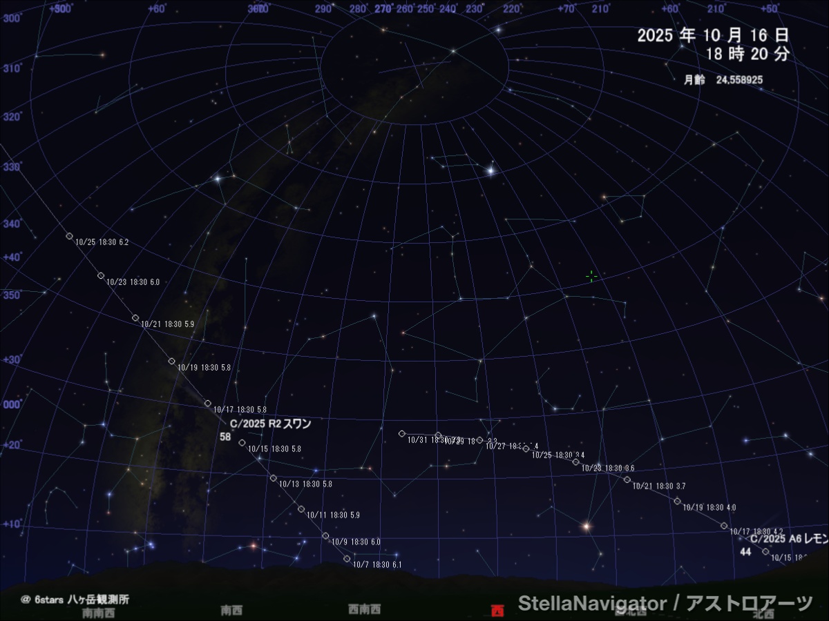 C/2025 R2 スワン彗星です。夕方の宵の空で6等前後と予測されています。晴れてほしいです。