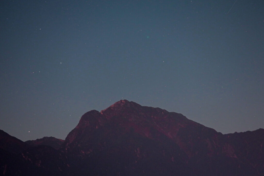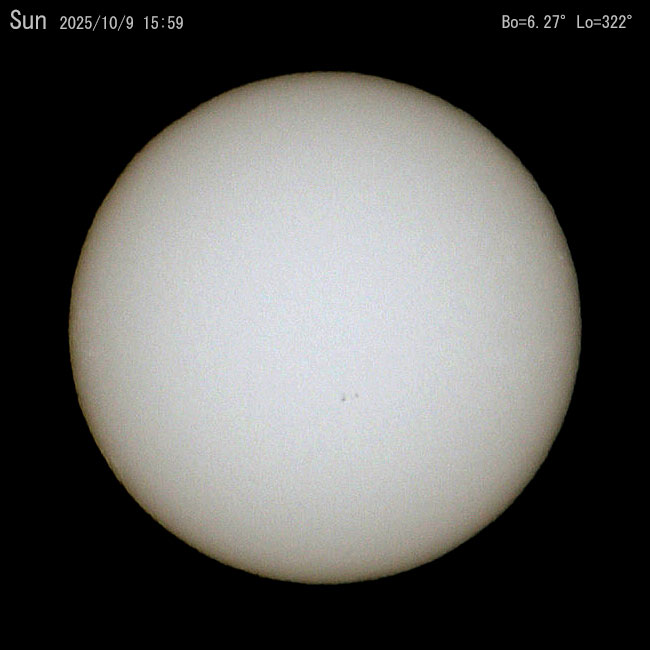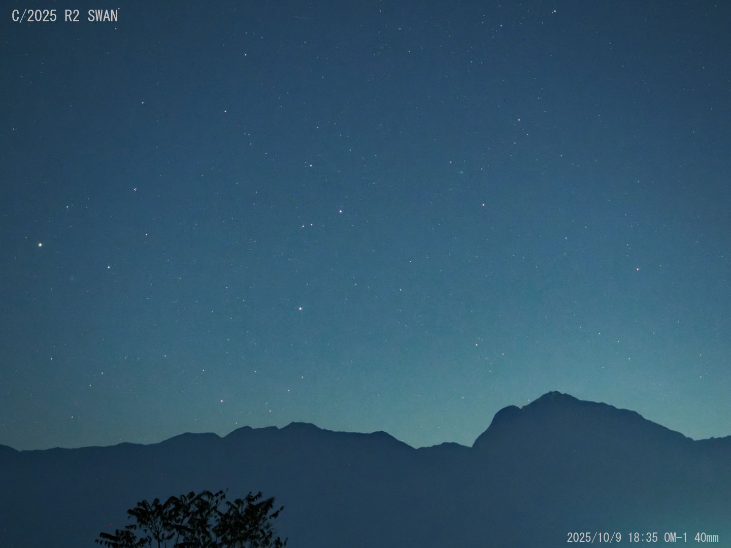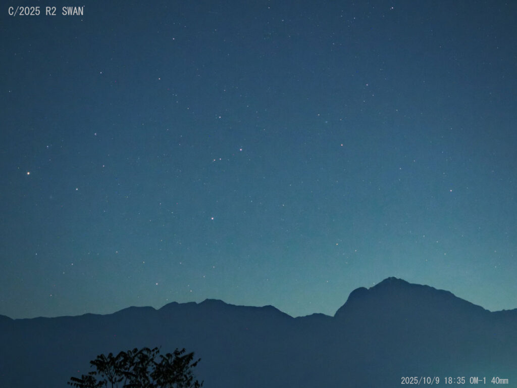 投稿日: 2025年10月9日2025年10月10日C/2025 R2 スワン彗星 今日の空 日の入後珍しく晴れたのでC2025 R2 スワン彗星を撮影しました。ちょうど甲斐駒ヶ岳の上に沈みかけたので40(80)㎜と200㎜望遠レンズで狙ってみました。予測光度は6.0等でやっと写るぐらいでした。肉眼、双眼鏡では確認できませんでした。40㎜の左側はさそり座の頭部で左端がアンタレスです。 OM-1 40mm(フルサイズ80㎜) Ra 200mm 今日の太陽。薄雲が掛かっていたので小さな黒点は写っていないようです。 👍いいね 0