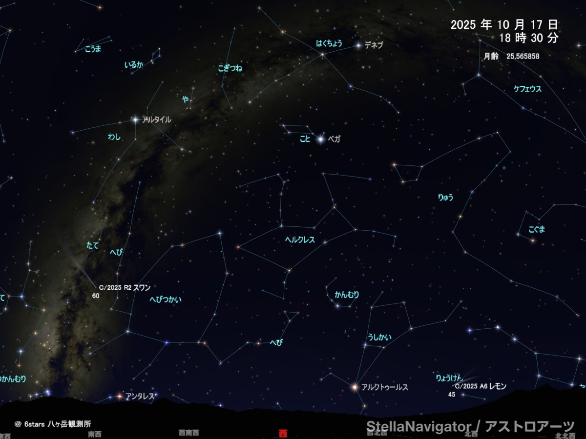 投稿日: 2025年10月14日2025年10月15日 投稿者: N.Kuwabara夕空にレモン彗星(C/2025 A6)が現れます 今日の空は曇り空。昨晩満天の星空だったので今朝はブルースカイだと思いましたが... 夕空でスワン彗星(C/2025 R2)の他にレモン彗星(C/2025 A6)が現れます。明日・明後日は天気が悪そうですが17日には天気が回復して見えそうです。レモン彗星は低空で肉眼では見えそうもないので、写真を撮影して確認してみます。 👍いいね 0