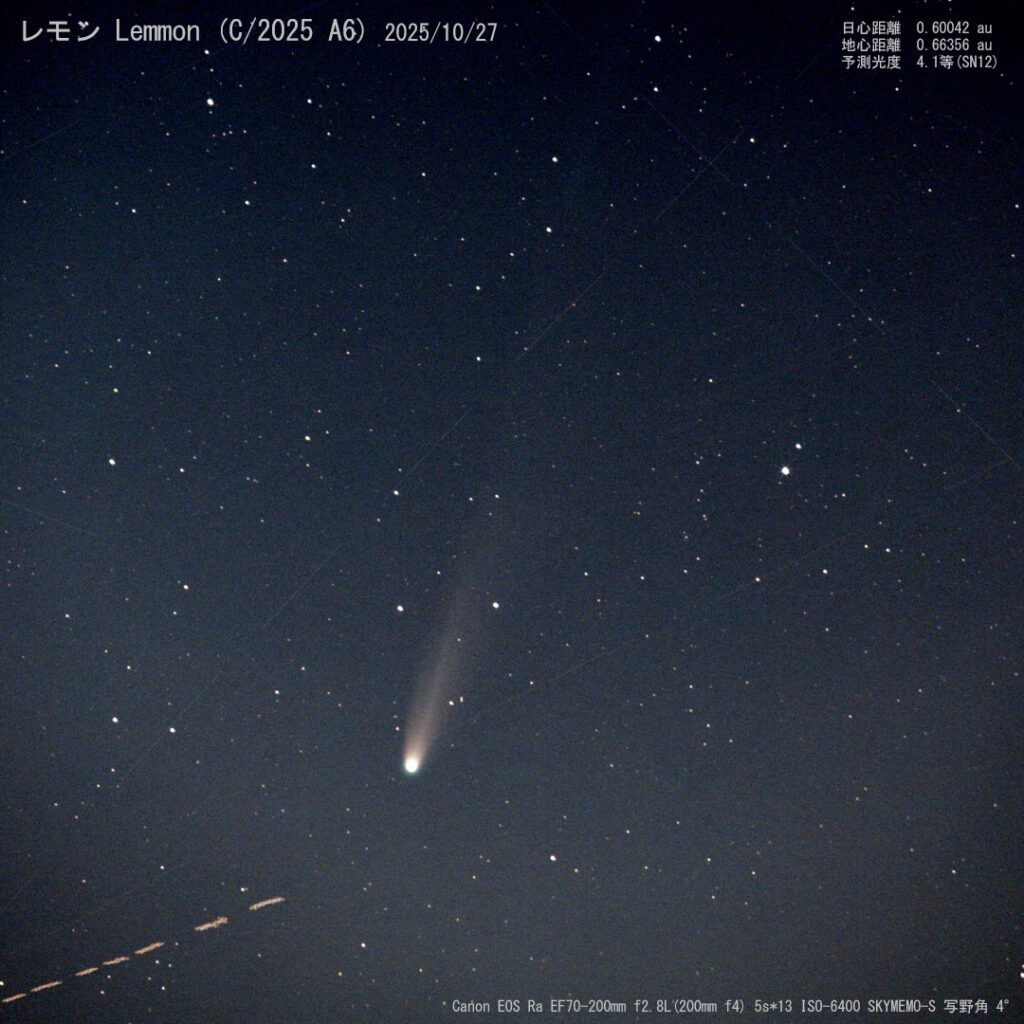 レモン彗星。雲が出ていて沈む頃に撮影しました。尾は画角いっぱい出ています。低空なので中々シャープな写真が取れません。