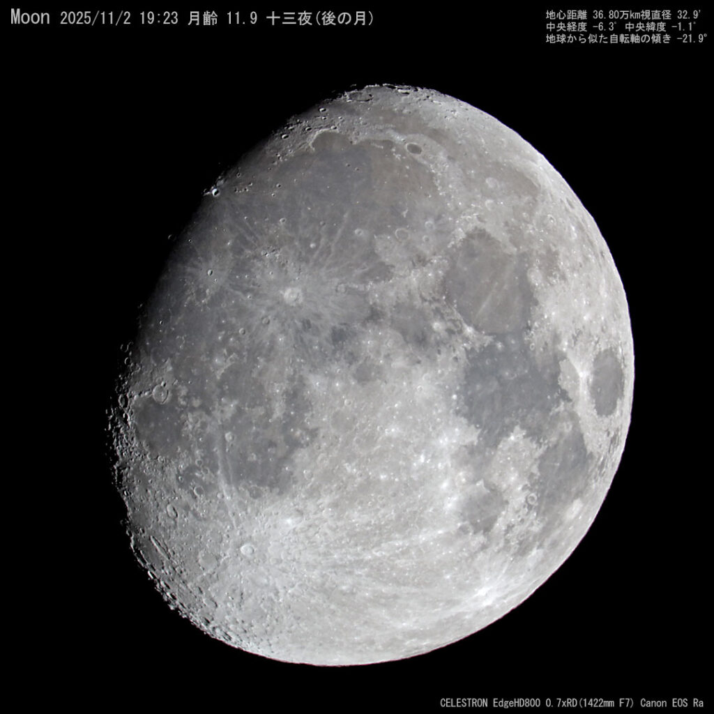 投稿日: 2025年11月2日2025年11月3日 投稿者: N.Kuwabara後の月 今日の空。未明から明け方までまとまった雨が降ったようで、北岳に雪が積もっていました。夕焼けが雲を茜色に染めました。 今日は後の月(十三夜)です。日の入りから雲が出てしまいましたが、19時頃からクッキリ見え始めました。十五夜は曇られましたが今回は見れました。月は5日に満月となり今年最大の満月(スーパームーン)です。 今日の太陽 👍いいね 0