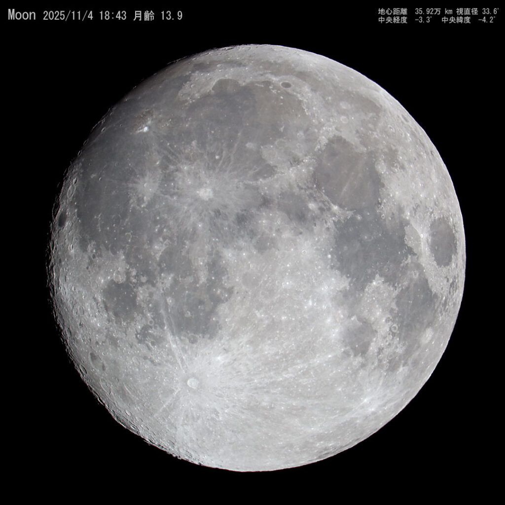もう一つおうし座南流星群の極大日です。5日21頃がピークで、火球が多いと言われています。満月で条件的には良くないです。流星は四方八方に流れるので満月の反対側を見ましょう。