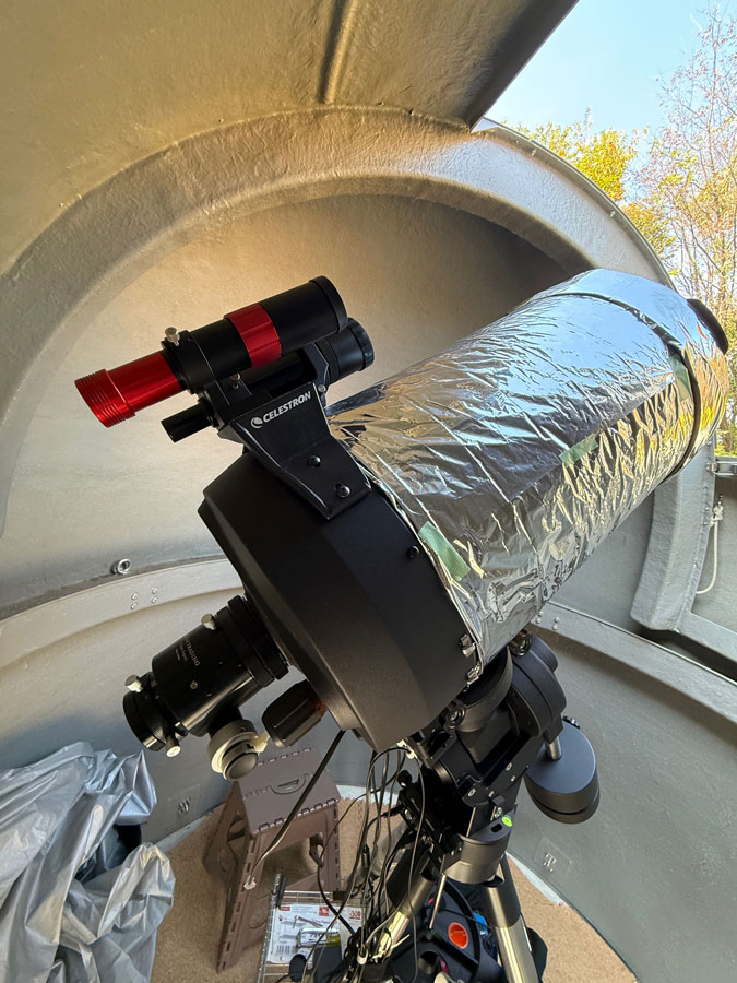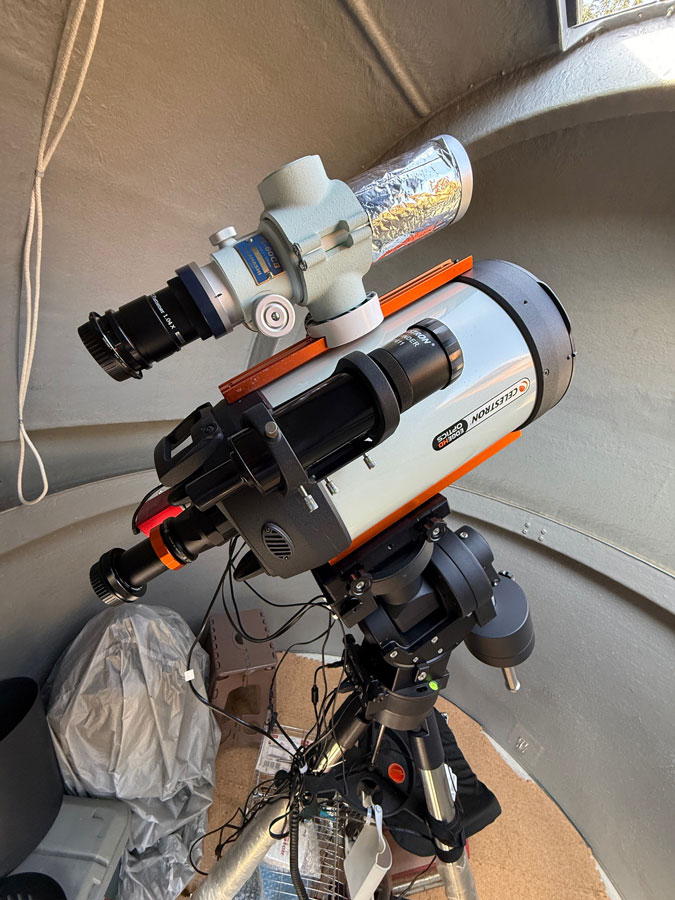 投稿日: 2025年11月7日2025年11月8日惑星撮影用の望遠鏡 今日の空。夜空も霞と月明かりで星空が良く見えませんでした。 観測ドームの望遠鏡を惑星撮影用に交換しました。口径20cm(HD800)から30cm(C11)に変わりました。 早速、土星を撮影しましたが、今晩は急流が荒れていて眼視でもぼやけていて撮影画像は環がクッキリしませんでした。 今日の太陽。左側の大きな黒点が活動的で地球に磁気嵐を起こす状況です。こんな時オーロラが発生するそうです。 👍いいね 1+