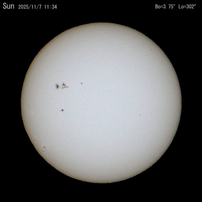 今日の太陽。左側の大きな黒点が活動的で地球に磁気嵐を起こす状況です。こんな時オーロラが発生するそうです。