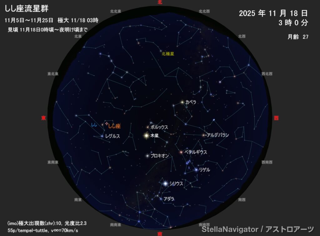 明日の日が変わって18日の未明にしし座流星群が極大を迎えます。見頃は18日00時から夜明けまで、風が強そうなので防寒対策は十分に。