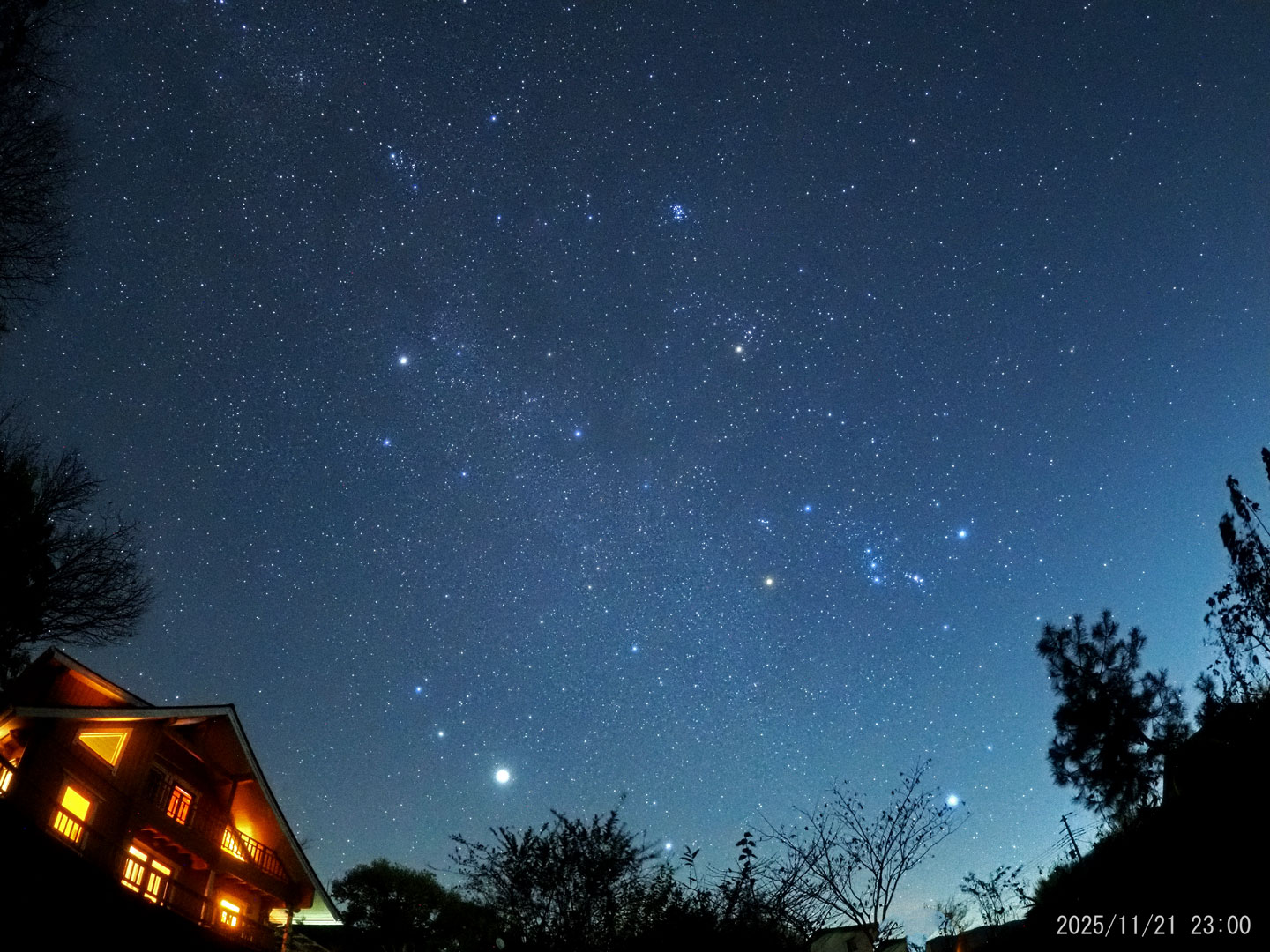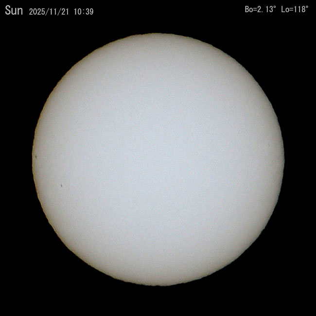 投稿日: 2025年11月21日2025年11月22日23時ごろの星空 今日の空は3日続けて青空です。朝の最低気温は-0.8℃と冷え込みました。 20時ごろは薄雲が出ていましたが、23時ごろは綺麗に星々が見えました。右下は全天で一番明るいシリウス(-1.44等)、左下は木星(‐2.5等)です。にぎやかな冬の星空がやってきました。 今日の太陽 👍いいね 0