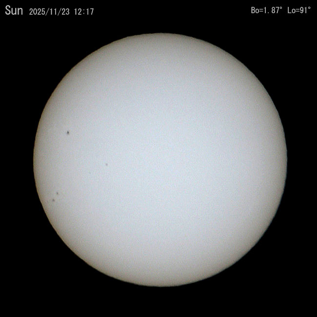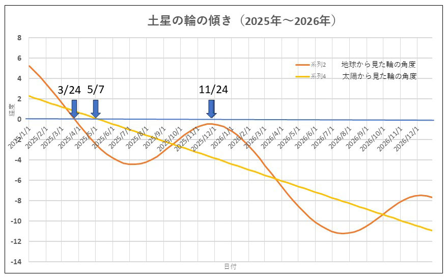 今日の土星。明日24日が地球から見た輪の角度が0度に最接近(-0.45°)しますが、団子に針を刺したように見えています。なお太陽からの日照は下を照らしていて土星本体中央やや上に影で線が出来ています。