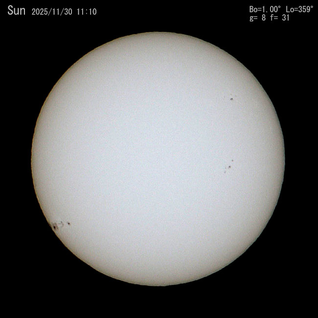 投稿日: 2025年11月30日2025年12月1日 投稿者: N.Kuwabara大きな黒点群が見えて来ました 今朝も青空です。麓では日中野焼きが多く空が霞んで(煙って)います。夜は半月を過ぎた月明かりで星々があまり見えません 今日の太陽。左側から大きな黒点群が出てきました。また地磁気嵐が始りそうです。 👍いいね 0