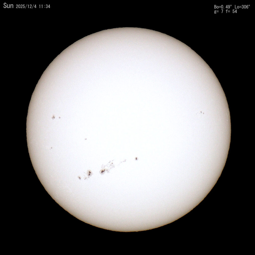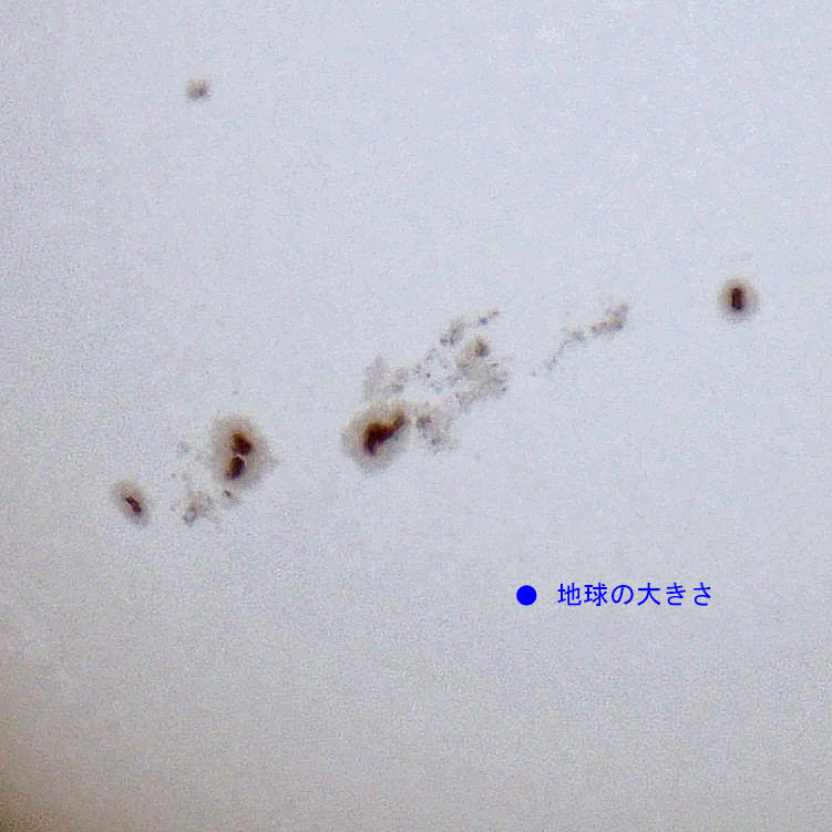 投稿日: 2025年12月4日2025年12月4日太陽の黒点の大きさ 今日の空は青さが戻りました。 太陽の黒点は大きいです。太陽の直径は地球の109倍なのでその大きさを想像して見ましょう。 等倍で切り出してみました。 👍いいね 0