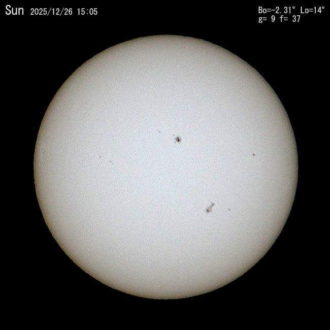投稿日: 2025年12月26日2025年12月27日 投稿者: N.Kuwabara少し降雪 今朝は雪が降ったようですが白くなった程度でした。大型の寒気団で山は雪雲をかぶっています。 今日の太陽。2日間見ないうちに2黒点群が発達していました。 月も顔を見せてくれました。月齢は6.3になっていました。明後日(28日)は下弦の月(半月)になります。 👍いいね 0