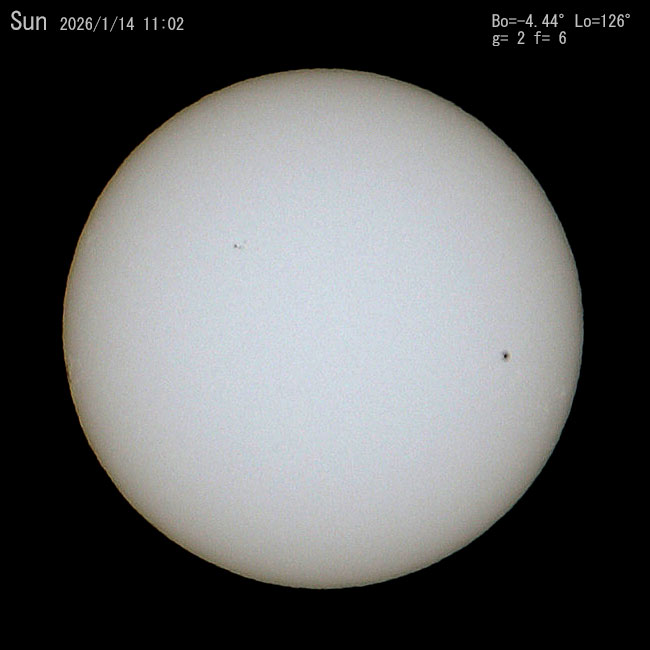 投稿日: 2026年1月14日2026年1月15日 投稿者: N.Kuwabara木星はまだシャープに見えません 今日は一日中強風が吹き荒れました。月は月齢25で細くなり19日に新月です。 今日の太陽。黒点群は2群と少ないですが、左縁から大き目な黒点群が見えだしました。 昨晩の木星。まだ気流が荒れています。今晩も見えましたが変わり映えしないかな 👍いいね 0