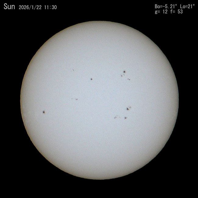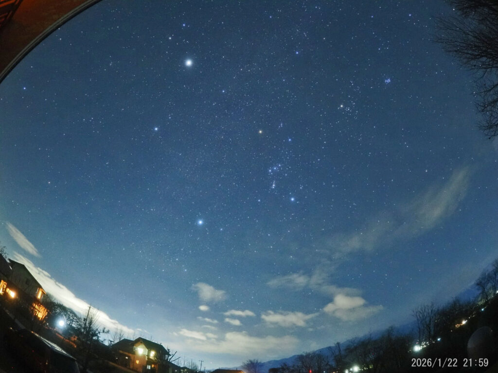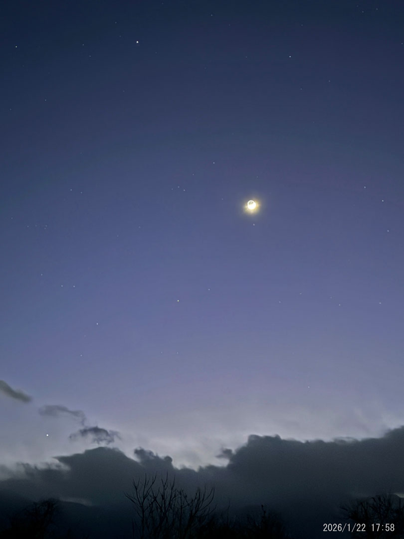 投稿日: 2026年1月22日2026年1月23日最高気温0℃に行かず 今日の空。昼間の最高気温はマイナス0.6℃で寒い一日でした。寒気団もそろそろ上に上がっていくかな? 今日の太陽は、気流の乱れが少ないです。 今宵の月はみずがめ座で輝いています。上やや左は土星、左下は南のうお座のフォーマルハウトです。 カノープスが22時ごろ見える季節になりました。今日は低空に雲が有ったので見えないと思っていたのですが、写真には写っていました。下の電柱のすぐ右です。 👍いいね 2+