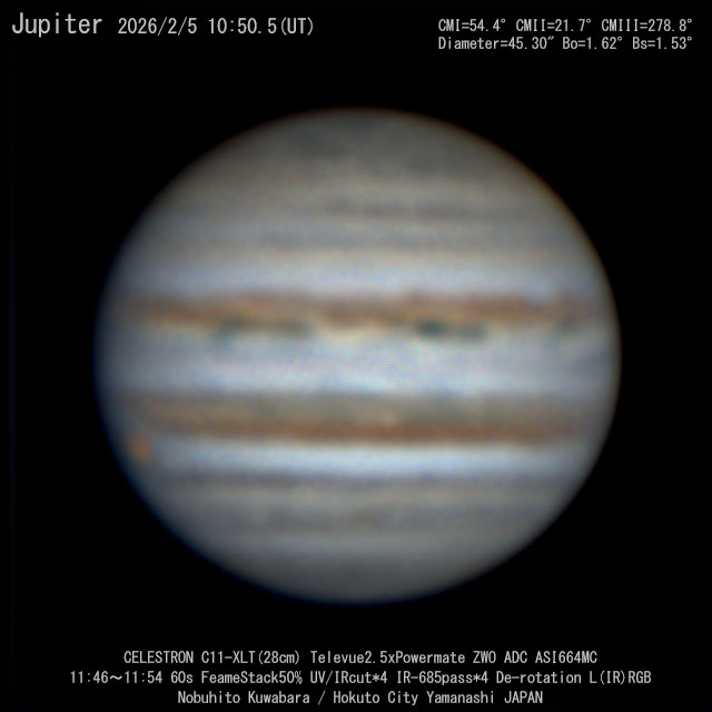 昨夜(5日)の木星。前回(3日)と同じように大赤斑が出てきたタイミングとなりましたが、シーイングが悪すぎました。