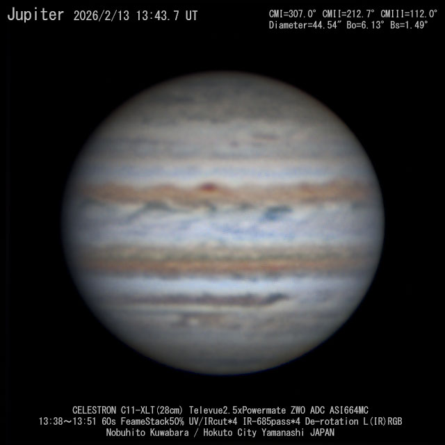 投稿日: 2026年2月14日2026年2月15日北の星空 今朝の南アルプス。朝焼けが綺麗でした。 今日の太陽 今晩の観察会の後、ちょっと移動して八ヶ岳が見える位置で北の星空。中心下に北極星・左にカシオペア座・右に北斗七星が見えました。 木星12日は薄明終了後で、遅くより気流が荒れていないと見て撮影してみました。 13日。昨日より少しシーイングが良かったようです。 👍いいね 0
