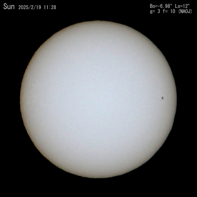 今日の太陽。黒点群は3個ですが中央に1個と中央右側に1個あります。